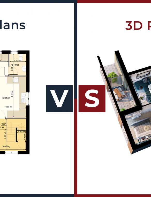 3D plans portray all the elements a space including its depth, lighting, textures, furnishings, and fittings. This allows viewers to grasp a full understanding of a space without relying on their imagination. In contrast, 2D plans show the strict necessity and give an accurate layout of a plan.